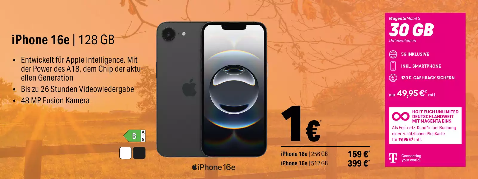1) Im Aktionszeitraum 01.10.–18.11.2025 erhalten Kunden bei Abschluss eines neuen Mobilfunk-Vertrags mit einer Mindestvertragslaufzeit von 24 Monaten in den Tarifen MagentaMobil XS und S mit oder ohne Endgerät einen Cashback in Höhe von 120 € sowie in den Tarifen MagentaMobil M, L und XL mit oder ohne Endgerät einen Cashback in Höhe von 240 € gutgeschrieben (ausgeschlossen sind PlusKarten Tarife, Young Tarife, Special Tarife, DTAG-Tarife, for Friends Tarife sowie Corporate Benefits Tarife und Datentarife). Einmaliger Bereitstellungspreis jeweils 39,95 €. Die Gutschrift ist nicht mit weiteren Aktionspromotions wie z. B. 6 Monate Grundpreisbefreiung kombinierbar. Zum Erhalt der Gutschrift (nach Ablauf der Widerrufsfrist) ist vom 01.11.2025–31.07.2026 eine Online-Registrierung über die MeinMagenta App (mit Klick auf Ihr Profil, „Cashback einlösen“) unter Vorlage der ersten Rechnung entsprechend den genannten Bedingungen erforderlich.